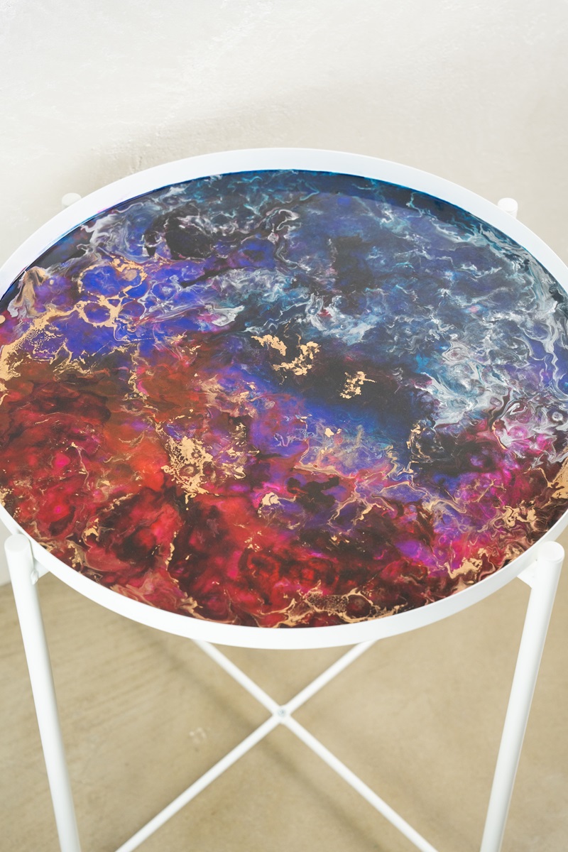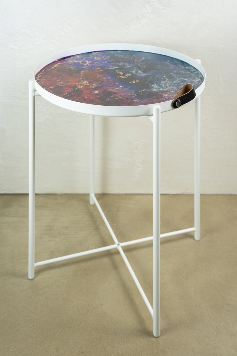 “Nebulosa” is an invitation to lose yourself in the infinitely large, in that suspended instant where matter and light merge in a cosmic breath. Its resin surface evokes a secret astral map, where gold insinuates itself between galaxies of red and indigo, like a spark of primordial energy that crosses time.