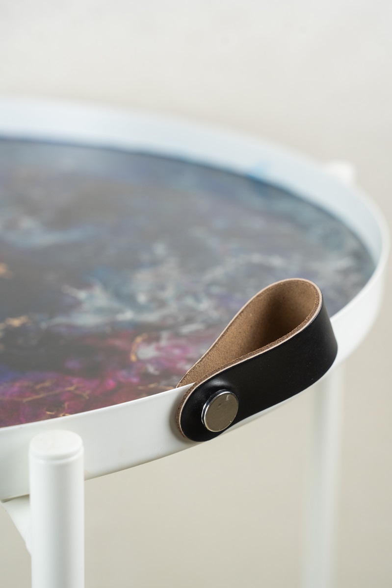Matte white painted metal frame with hand-cast artistic resin top. Black leather detail with metal button.