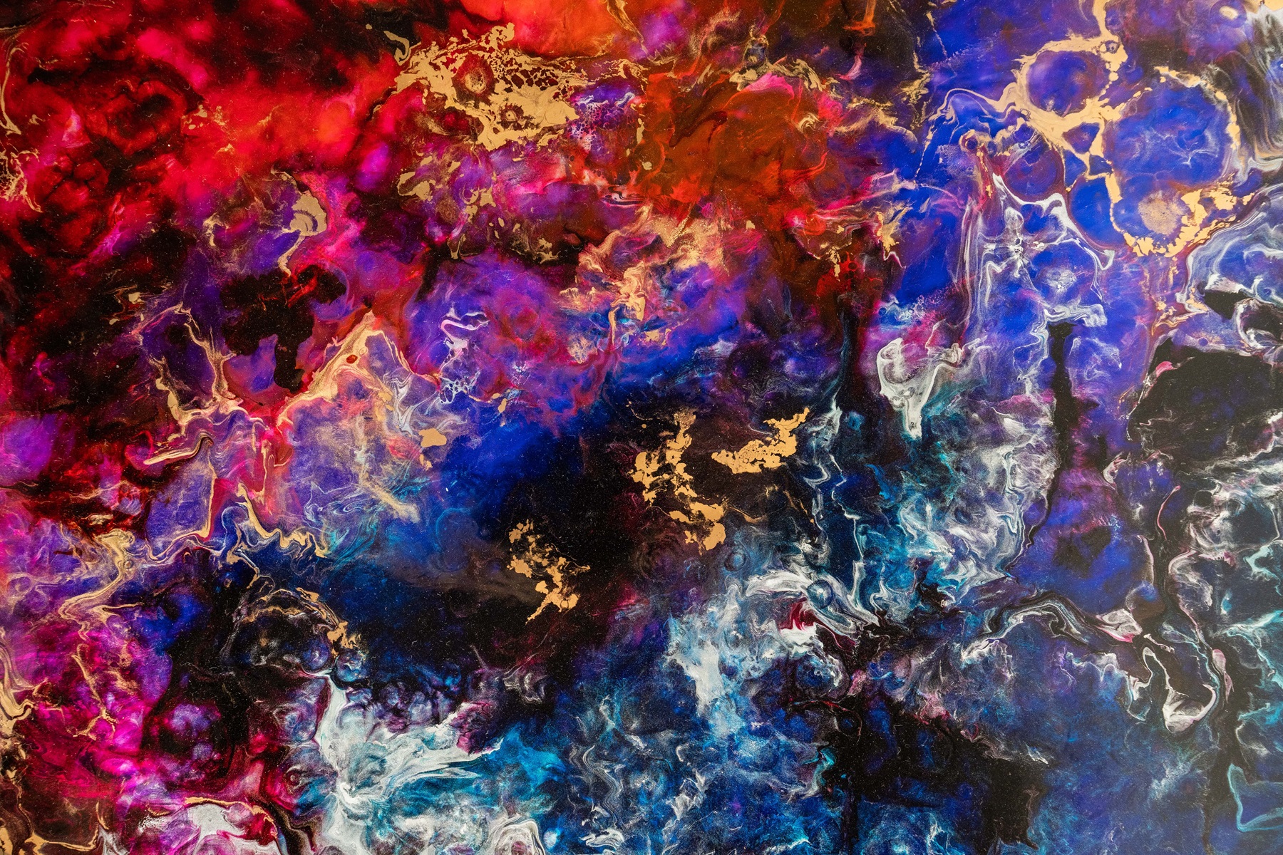 Artistic composition in multilayered resin, mineral pigments, gold inserts and manual processing for a unique cosmic and iridescent effect.
