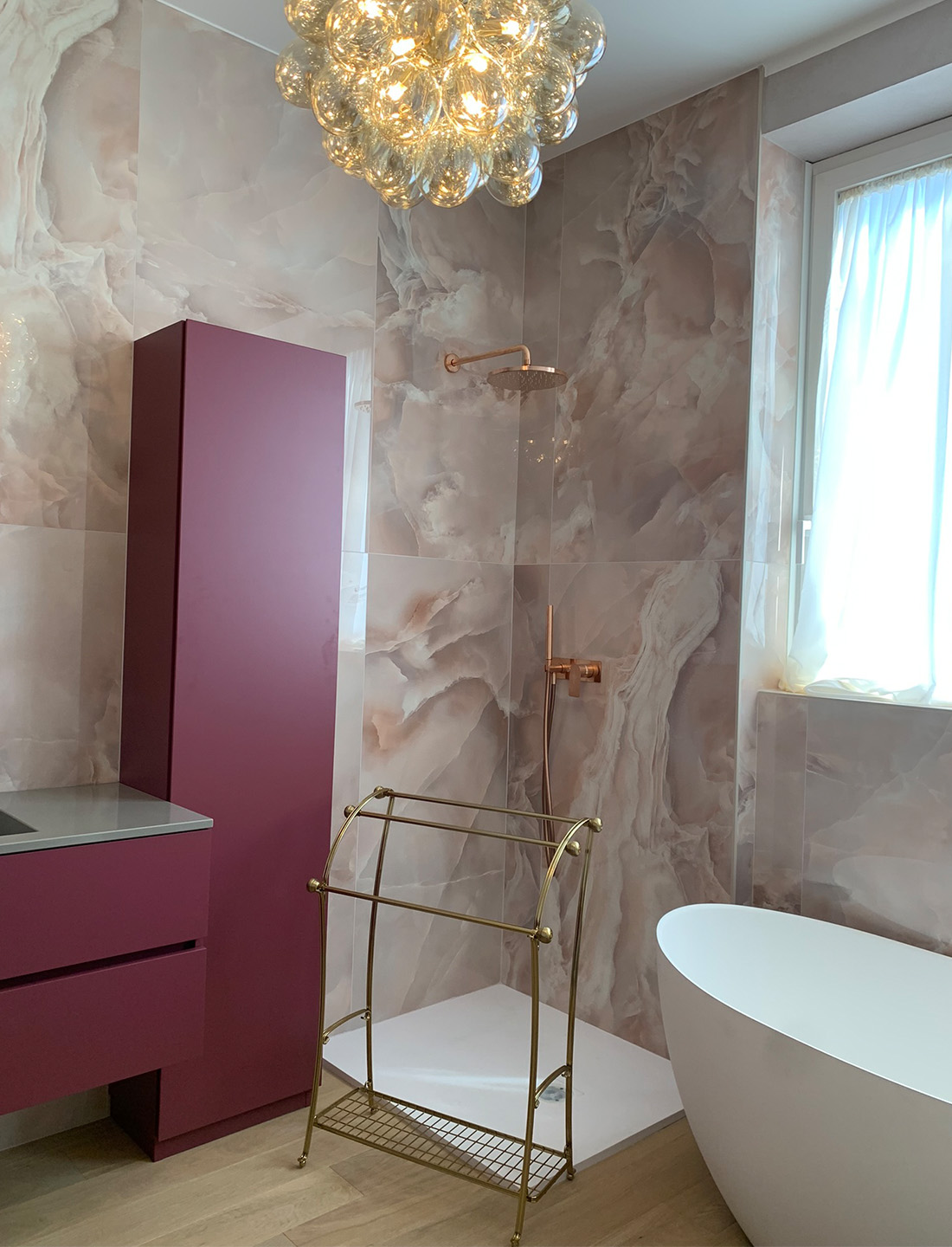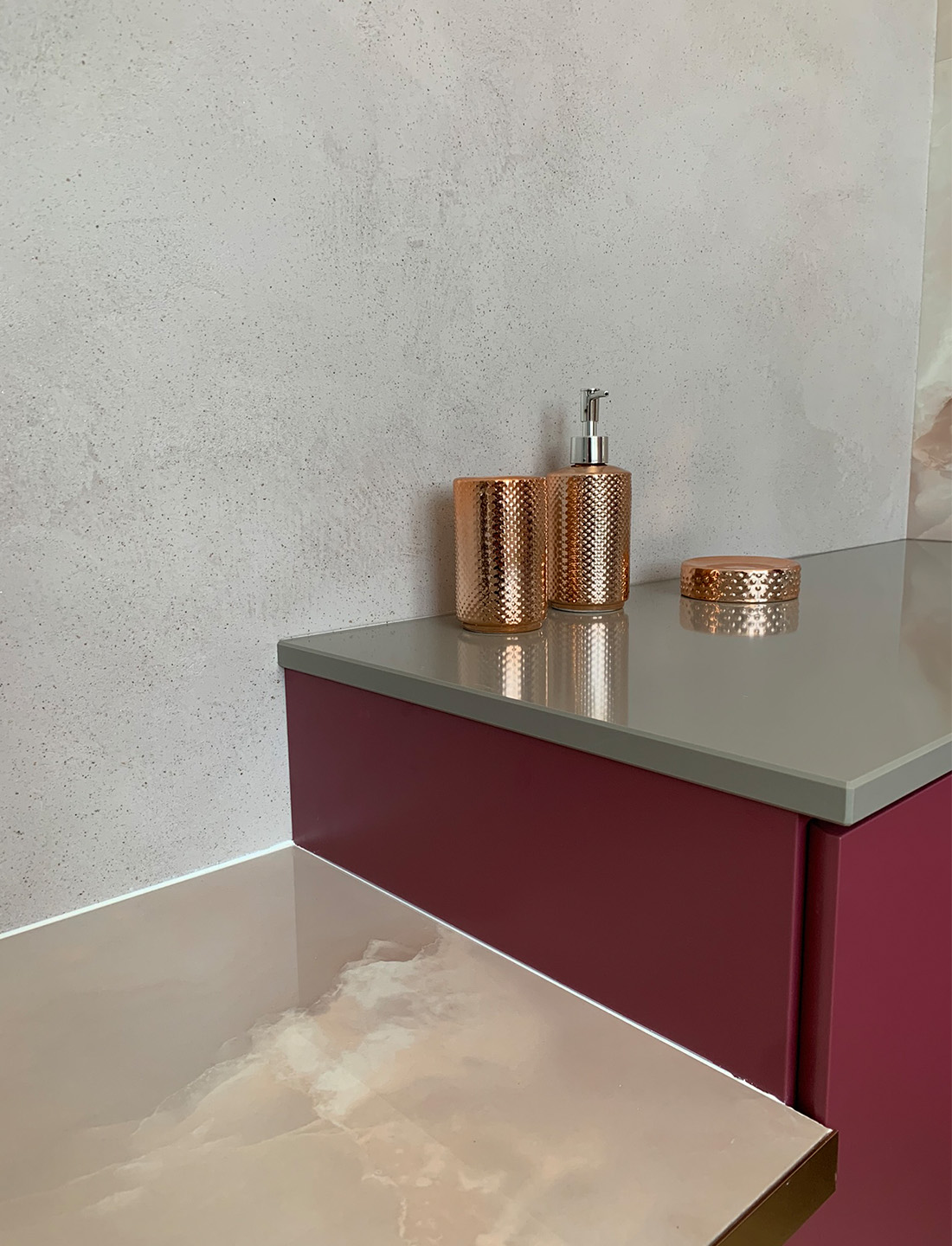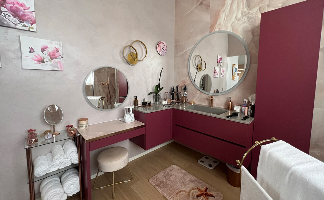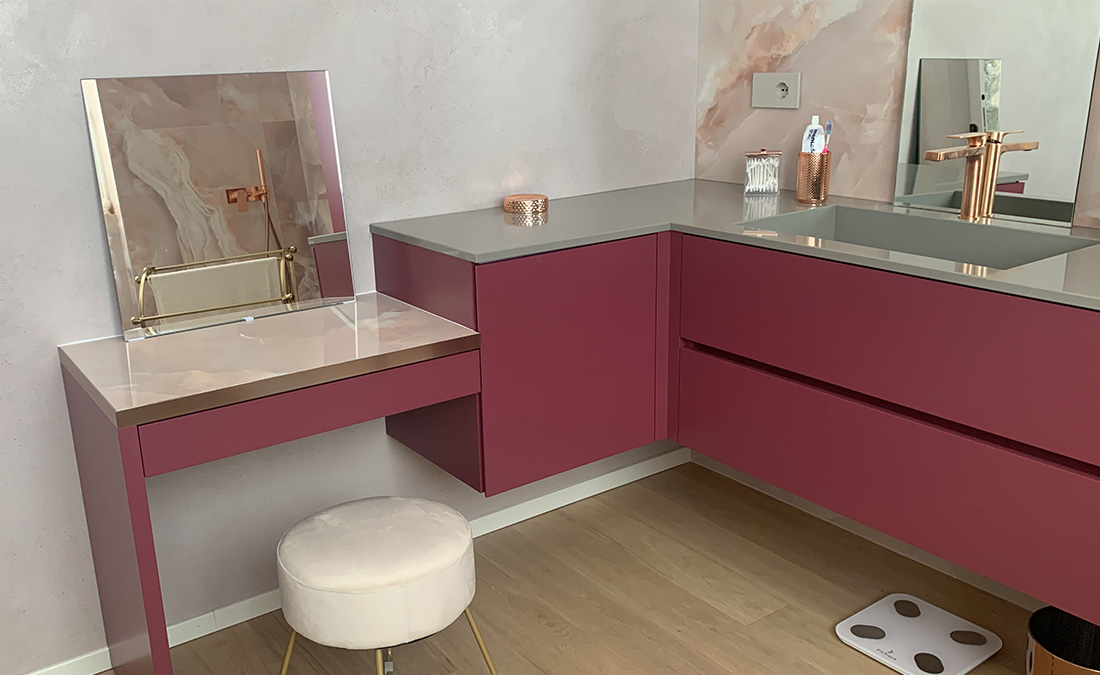 Produzione arredobagno su misura, laccato opaco, soft touch con piano in quarzo