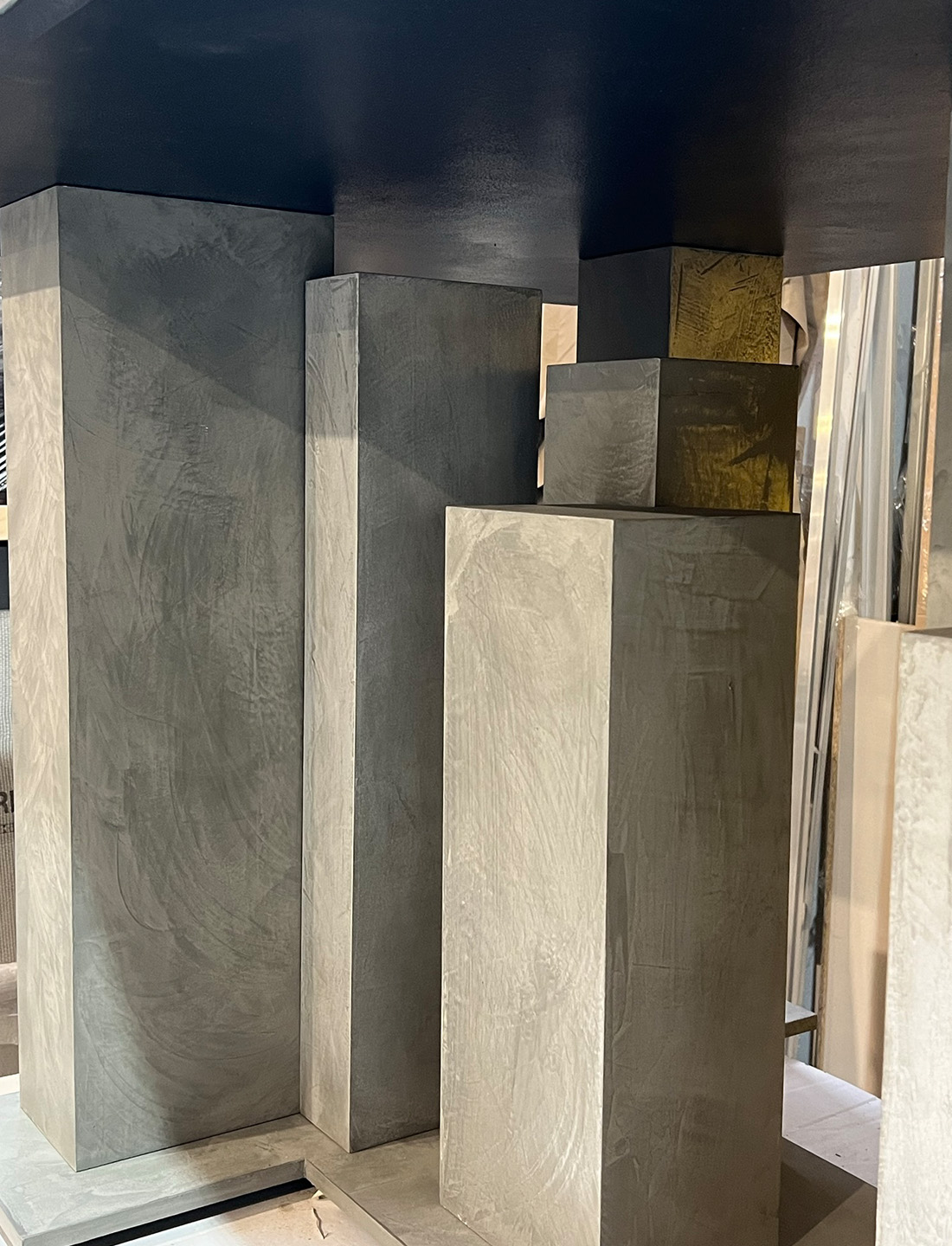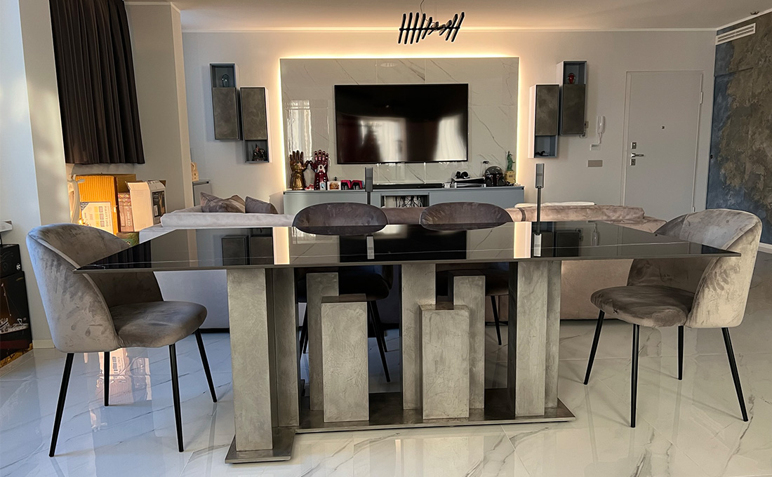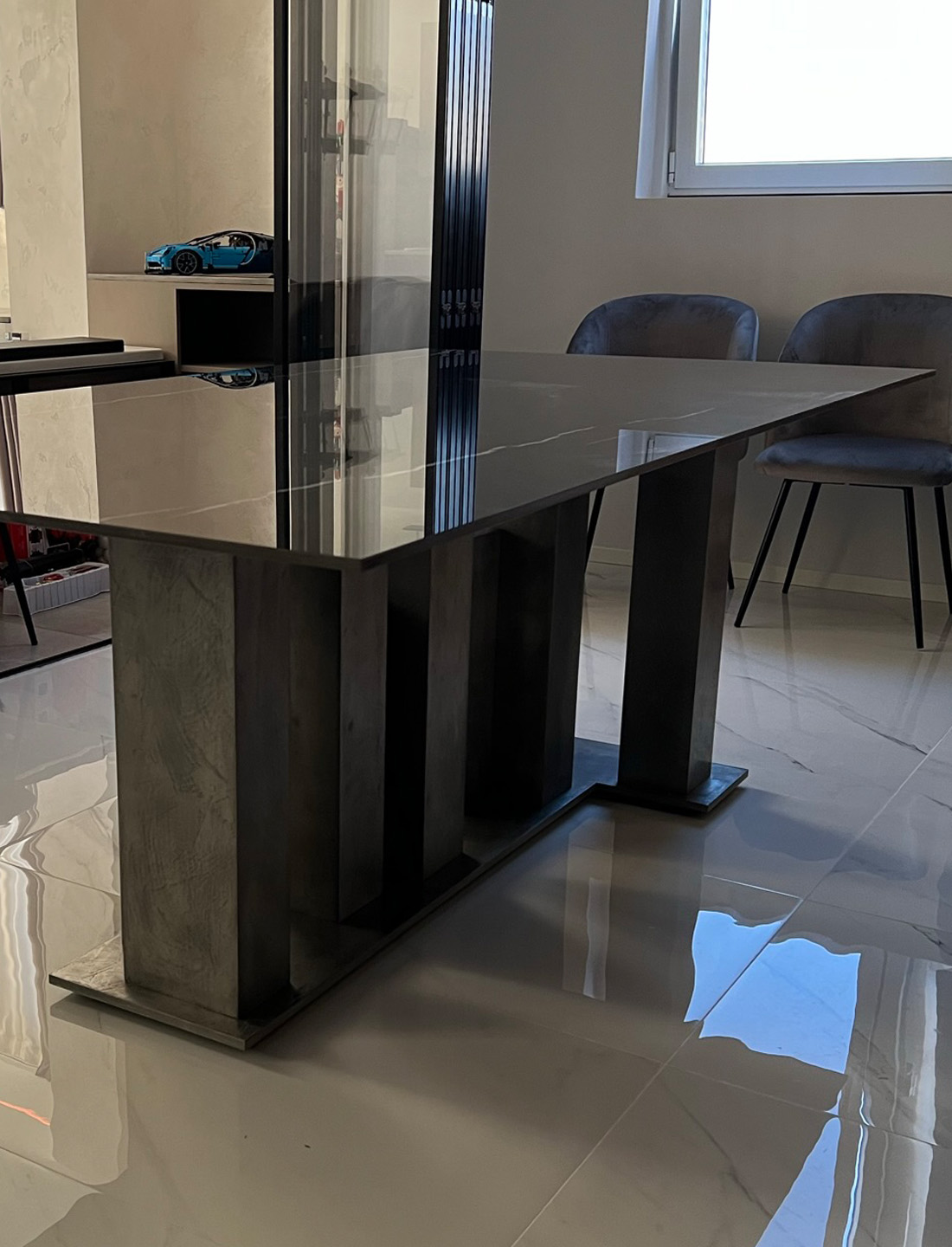 Tavolo da pranzo su misura con gamba in metallo fuso e piano in marmo nero